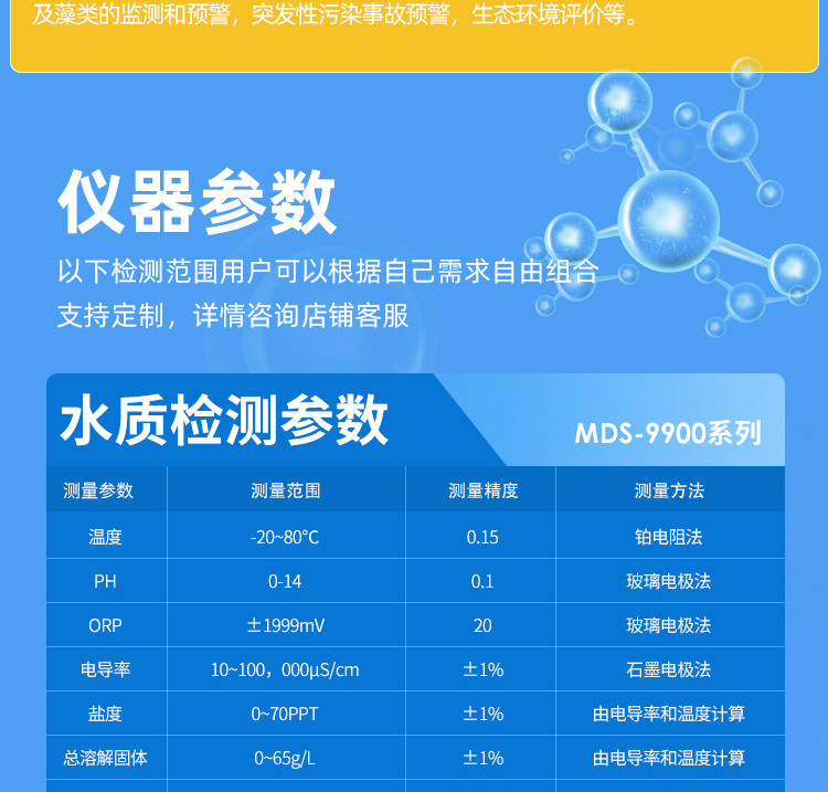 总溶解固体(TDs) | 由电导率和温度计算 | (0-65)g/L | ±1% |